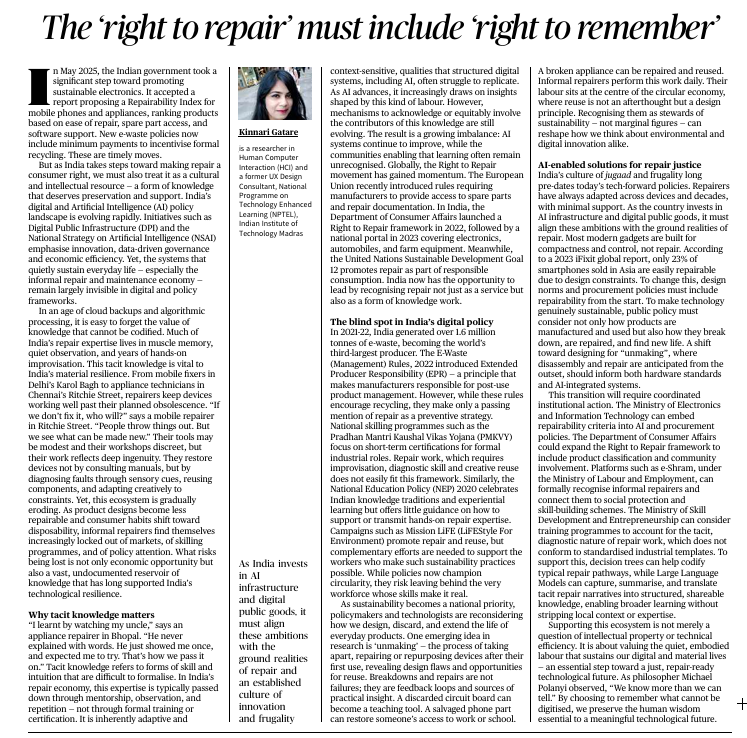 - This is part of a global push for the Right to Repair (R2R), but the article argues India must also protect the knowledge systems that underpin repair work—what the author calls the ‘Right to Remember’.
